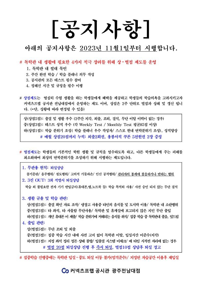 커넥츠프랩 공시관 상벌점 규정 안내 2023-08-10 조회수1052 공지사항_1.jpg학습시간 엄격준수_1.jpg prev 커넥츠프랩 매일영어훈련 PROGRAM LIST next FULL CARE 독학 관리시스템
